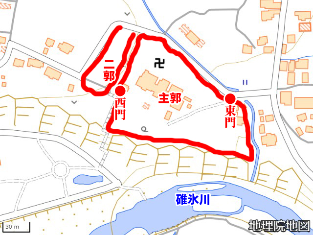 碓氷川北岸の高さ10メートルほどの崖上に築かれた城で、主郭の周囲を二郭が取り囲んでいたようである。