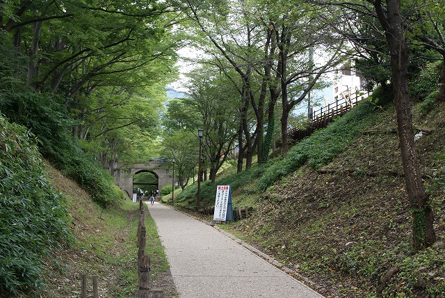 昭和2年(1927)から昭和47年(1972)まで堀底は上田交通真田傍陽線の線路として利用され、公園駅のプラットホームが設けられていた。