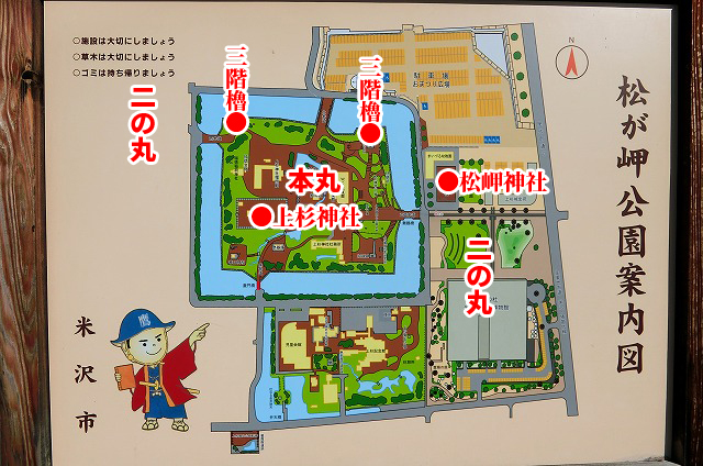米沢城主要部縄張図(現地案内板より)。