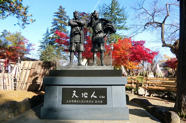 平成21年の大河ドラマ・天地人の放送を記念して立てられた上杉景勝と直江兼続の像。